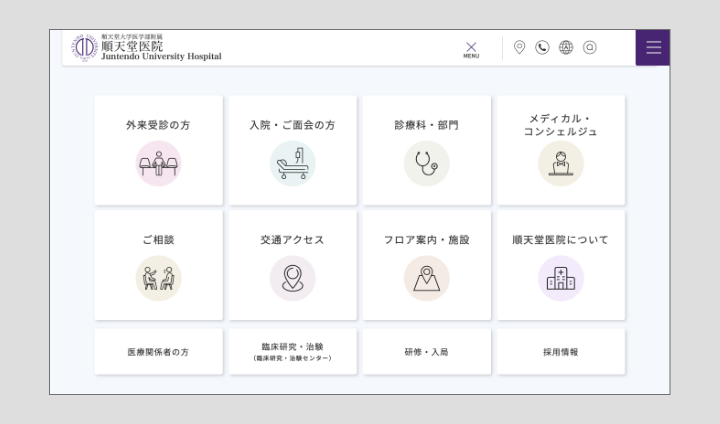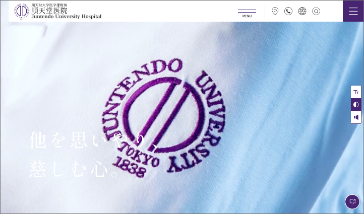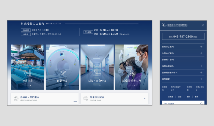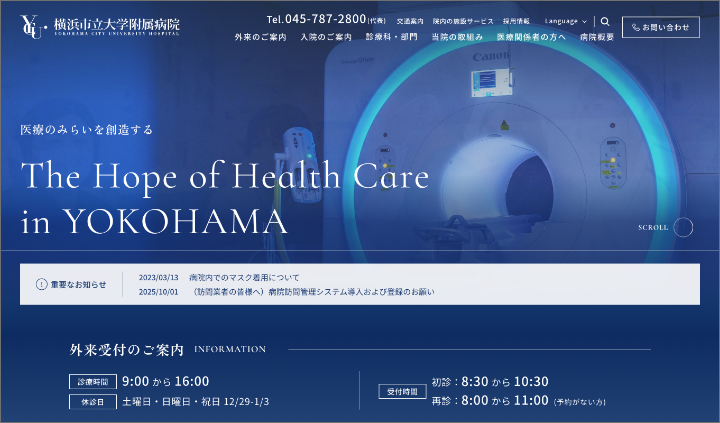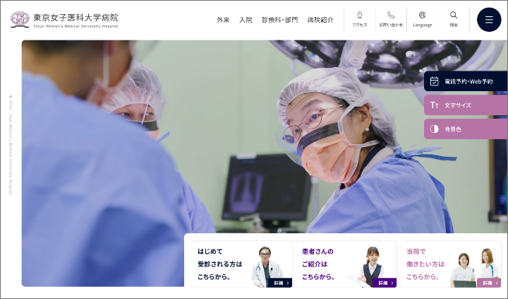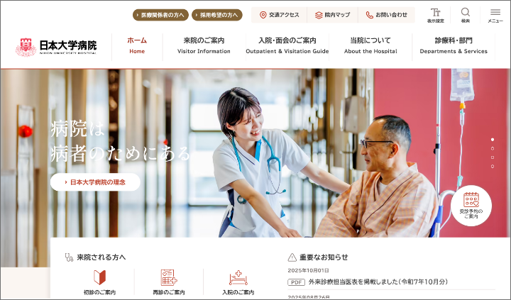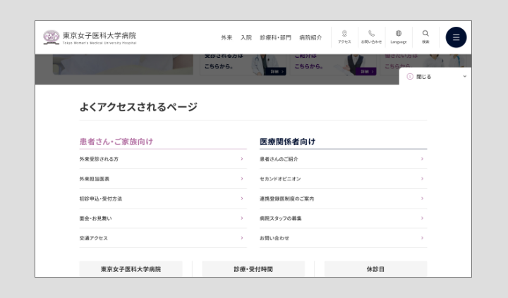 患者、医療関係者、学生といったマルチなターゲットを想定した導線設計。特定機能病院として、それぞれのニーズに応える高い情報整理能力を発揮しています。