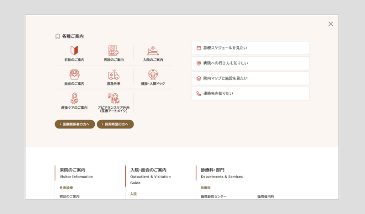 利用者属性(初診/再診/面会)に基づく巨大な入口をトップページに設け、ユーザーの情報探索の迷いを最小化する優れた情報アーキテクチャを実践しています。