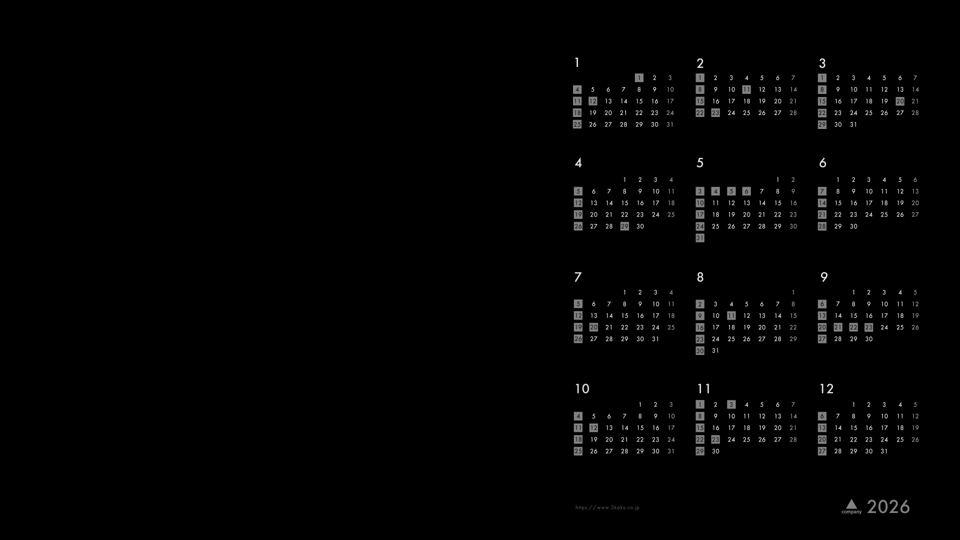 「Merry Christmas & Happy New Year!」 2026年版デスクトップカレンダー(PC用)を作成しました。 シンプルで、意外と実用的な壁紙ですので、ぜひお試しください! 2026年が皆様にとって明るい1年になりますように!! ペインティングver.ダウンロードはこちら 通常ver.ダウンロードはこちら ダークver.ダウンロードはこちら サンカクカンパニーの企業サイトはこちら PrevNext